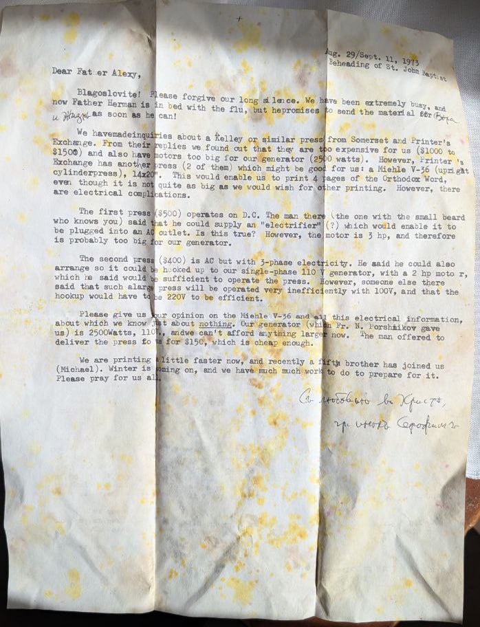 Letter of Fr. Seraphim Rose to Father Alexey Poluektov regarding the purchase of a new, larger printing press